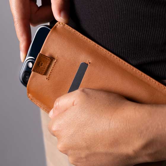 Il nostro design più sottile, la Custodia Slim Pull Sleeve offre una vestibilità aderente al vostro iPhone, completata da una comoda linguetta a strappo per un facile accesso. Una tasca posteriore a estrazione rapida offre spazio per le carte di credito, per tenere gli oggetti essenziali a portata di mano.